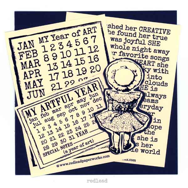 My Artful Year Calendar Rubber Stamp  The My Artful Year Calendar stamp is about 2-1/2" x 3-1/2". Stamp your planners, journals, artist trading cards, and all of your mixed media art with this Calendar Rubber Stamp. The stamps are trimmed to size and on a storage card.  The stamps are made in the USA of premium cling mount red rubber. A Red Lead exclusive design.  Click here for Antique Mail Art!