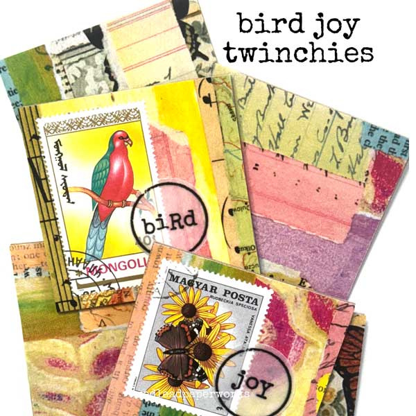 Gather up your vintage papers, collage sheet scraps, postage stamps, junk mail envelopes, dictionary papers, painted papers, and old photos.